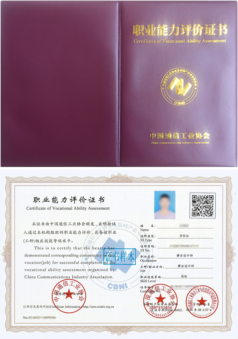 舞台设计师证书是相关从业人员可以重点学习和考取的证书,该证书表明持有者已经通过相关课程的培训和考核,具备相关的专业知识和职业技能,是岗前培训、在职培训、职业技能提升培训、创业培训的证明,是劳动者任职、上岗的参考依据之一。 证书编号为唯一编码,证书有效性可通过发证单位指定的官网查询。
