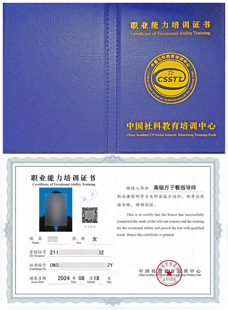 月子餐指导师证书是相关从业人员可以重点学习和考取的证书,该证书表明持有者已经通过相关课程的培训和考核,具备相关的专业知识和职业技能,是岗前培训、在职培训、职业技能提升培训、创业培训的证明,是劳动者任职、上岗的参考依据之一。 证书编号为唯一编码,证书有效性可通过发证单位指定的官网查询。