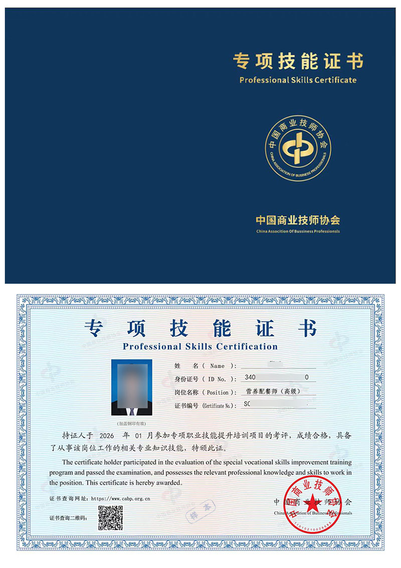 营养配餐师证书是相关从业人员可以重点学习和考取的证书,该证书表明持有者已经通过相关课程的培训和考核,具备相关的专业知识和职业技能,是岗前培训、在职培训、职业技能提升培训、创业培训的证明,是劳动者任职、上岗的参考依据之一。 证书编号为唯一编码,证书有效性可通过发证单位指定的官网查询。