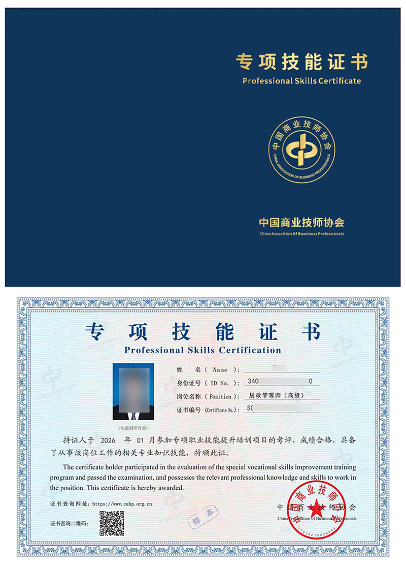 厨政管理师证书是相关从业人员可以重点学习和考取的证书,该证书表明持有者已经通过相关课程的培训和考核,具备相关的专业知识和职业技能,是岗前培训、在职培训、职业技能提升培训、创业培训的证明,是劳动者任职、上岗的参考依据之一。 证书编号为唯一编码,证书有效性可通过发证单位指定的官网查询。